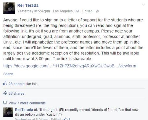 The letter complains that since the resolution came to light, “UCI has been inundated with racist, xenophobic comments and death threats against the students from people who are, precisely, invested in the paraphernalia of nationalism,” and that UCI’s Facebook page has “filled up with violent and racist remarks” which its moderator did not delete.