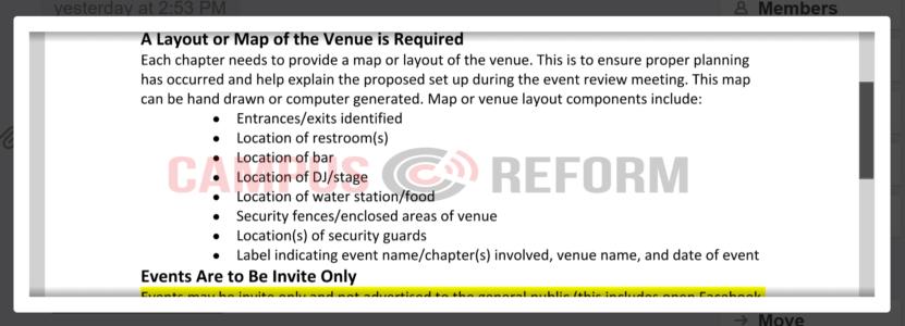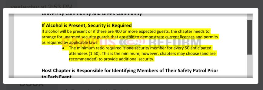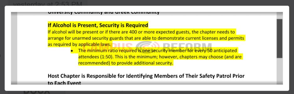 “If alcohol will be present or if there are 400 or more expected guests, the chapter needs to arrange for unarmed security guards that are able to demonstrate current licenses and permits as required by applicable laws,” the policy states.
