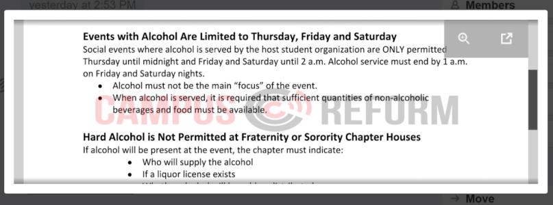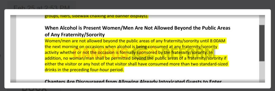 Now the school is requiring “women/men” to remain in “the public areas of any fraternity/sorority until 8:00AM the next morning on occasions when alcohol is being consumed,” seemingly attempting to limit sexual encounters.
