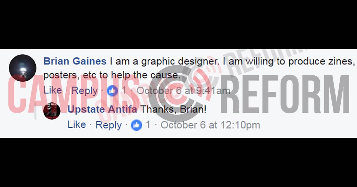 - In response to a Facebook post from "Upstate Antifa" soliciting logistical support, Graduate Teacher of Record Brian Gaines volunteered his skills as a "graphic designer."