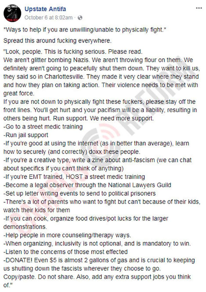 In a recent Facebook post, Upstate Antifa outlined several “ways to help if you are unwilling/unable to physically fight,” directing supporters to “Spread this around fucking everywhere.”