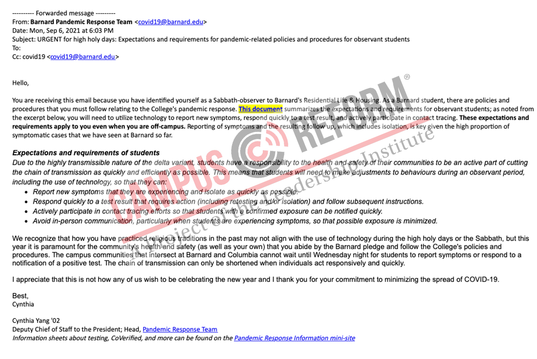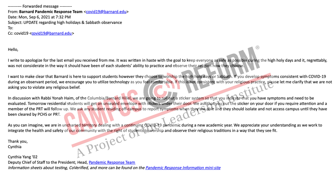 The email claimed that Barnard simply could not wait a day, after Rosh Hashana ended, for students to report symptoms.