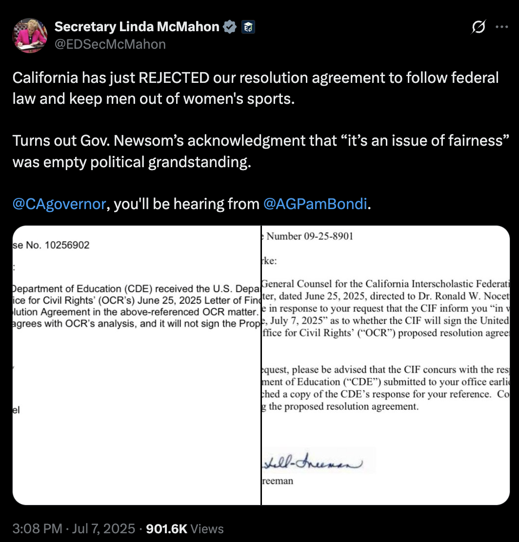 The Trump administration had given state officials 10 days to comply with a resolution letter issued June 25. The letter found that both CDE and CIF violated Title IX by allowing male athletes—based on gender identity—to compete in girls’ sports. The resolution would have required California to implement biology-based definitions of sex, revoke titles awarded to male athletes in girls’ events, and issue formal apologies to affected female athletes.