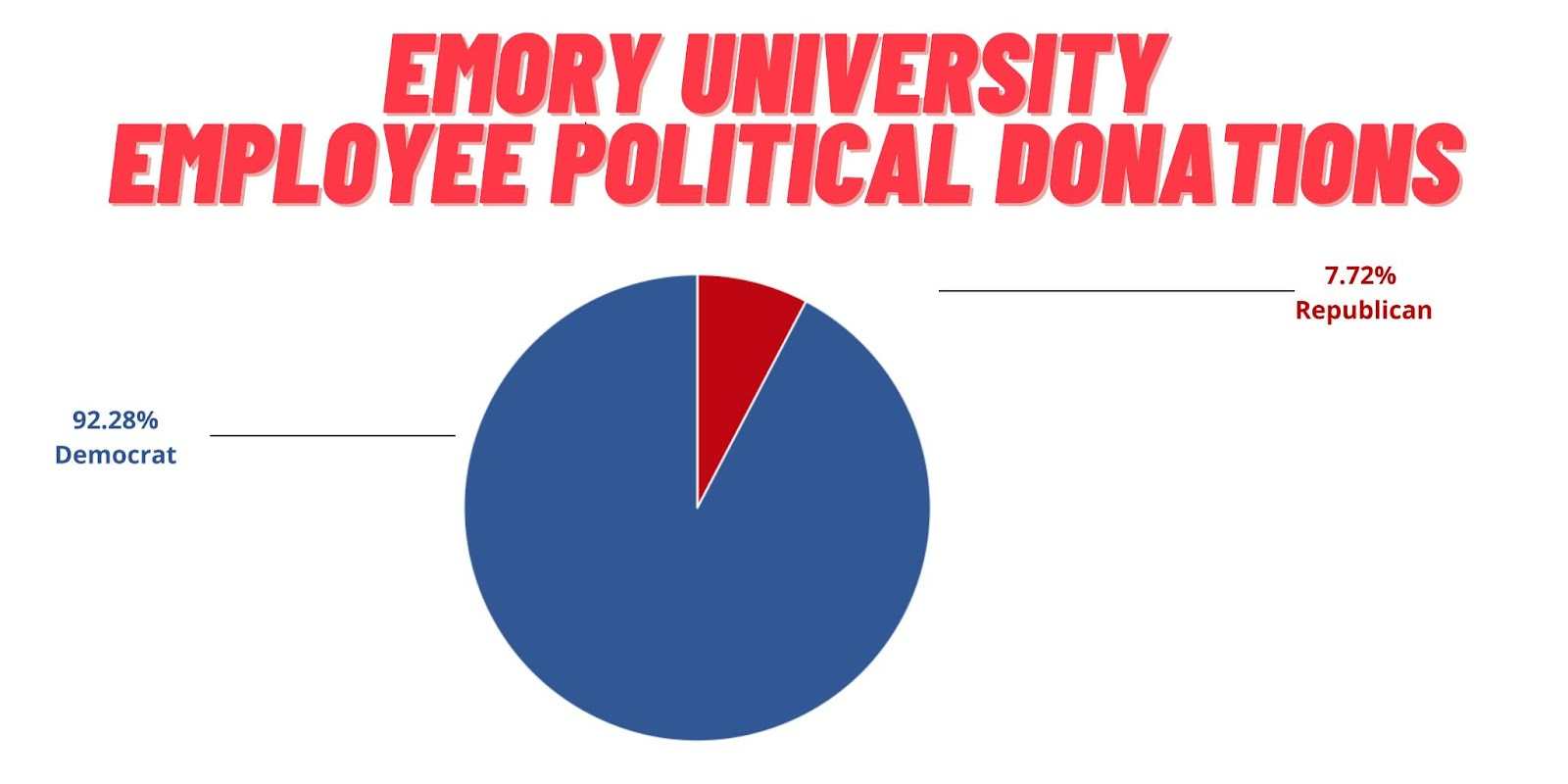 In the 2020 election cycle, 92.28% of Emory University employee donations went to Democratic candidates in federal elections, while 7.72% of donations went to Republican candidates in federal elections, according to data from OpenSecrets.