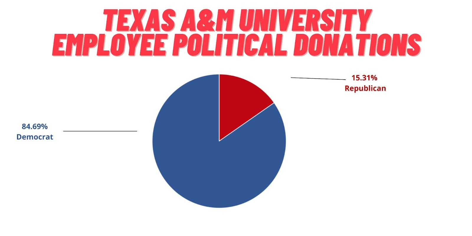In the 2020 election cycle, 84.69% of Texas A&M University employee donations went to Democratic candidates in federal elections, while 15.31% of donations went to Republican candidates in federal elections, according to data from OpenSecrets.