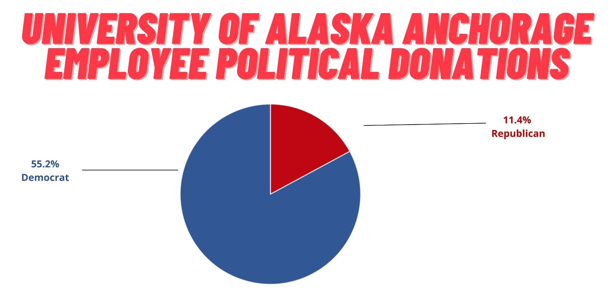 In the 2020 election cycle, 55.2% of University of Alaska Anchorage employee donations went to Democratic candidates in federal elections, while 11.4% of donations went to Republican candidates in federal elections, according to data from OpenSecrets.