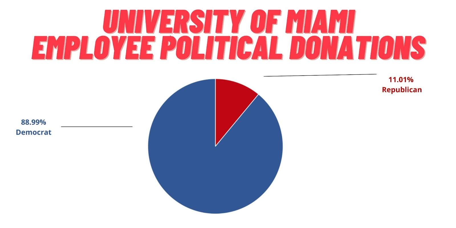 In the 2020 election cycle, 88.99% of University of Miami employee donations went to Democratic candidates in federal elections, while 11.01% of donations went to Republican candidates in federal elections, according to data from OpenSecrets.