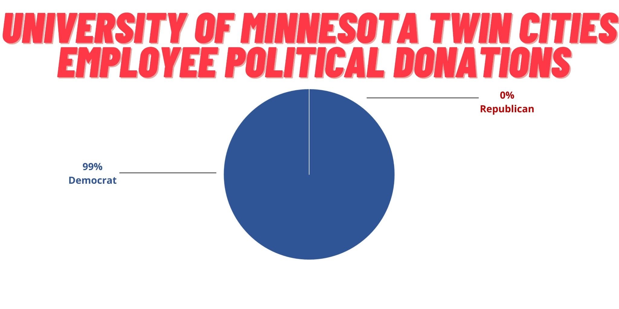 In the 2020 election cycle, 99% of University of Minnesota Twin Cities employee donations went to Democratic candidates in federal elections, while 0% of donations went to Republican candidates in federal elections, according to data from OpenSecrets.