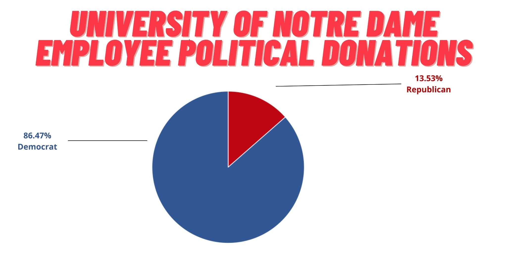 In the 2020 election cycle, 86.47% of University of Notre Dame employee donations went to Democratic candidates in federal elections, while 13.53% of donations went to Republican candidates in federal elections, according to data from OpenSecrets.