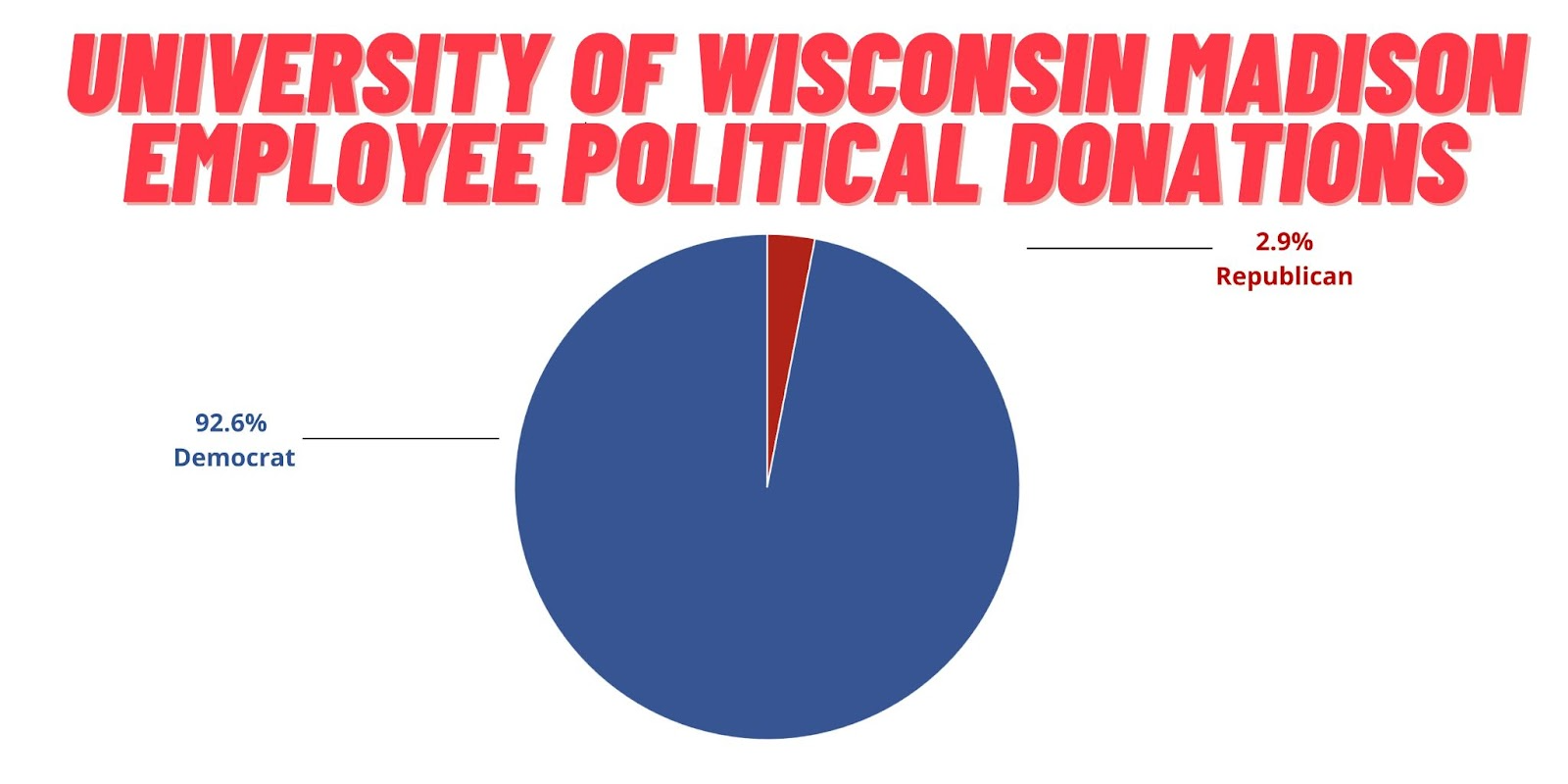 In the 2020 election cycle, 92.6% of University of Wisconsin Madison employee donations went to Democratic candidates in federal elections, while 2.9% of donations went to Republican candidates in federal elections, according to data from OpenSecrets.