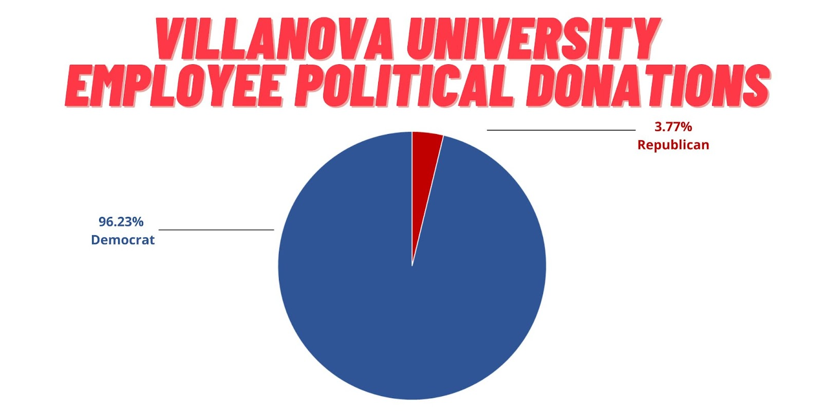 In the 2020 election cycle, 96.23% of Villanova University employee donations went to Democratic candidates in federal elections, while 3.77% of donations went to Republican candidates in federal elections, according to data from OpenSecrets.