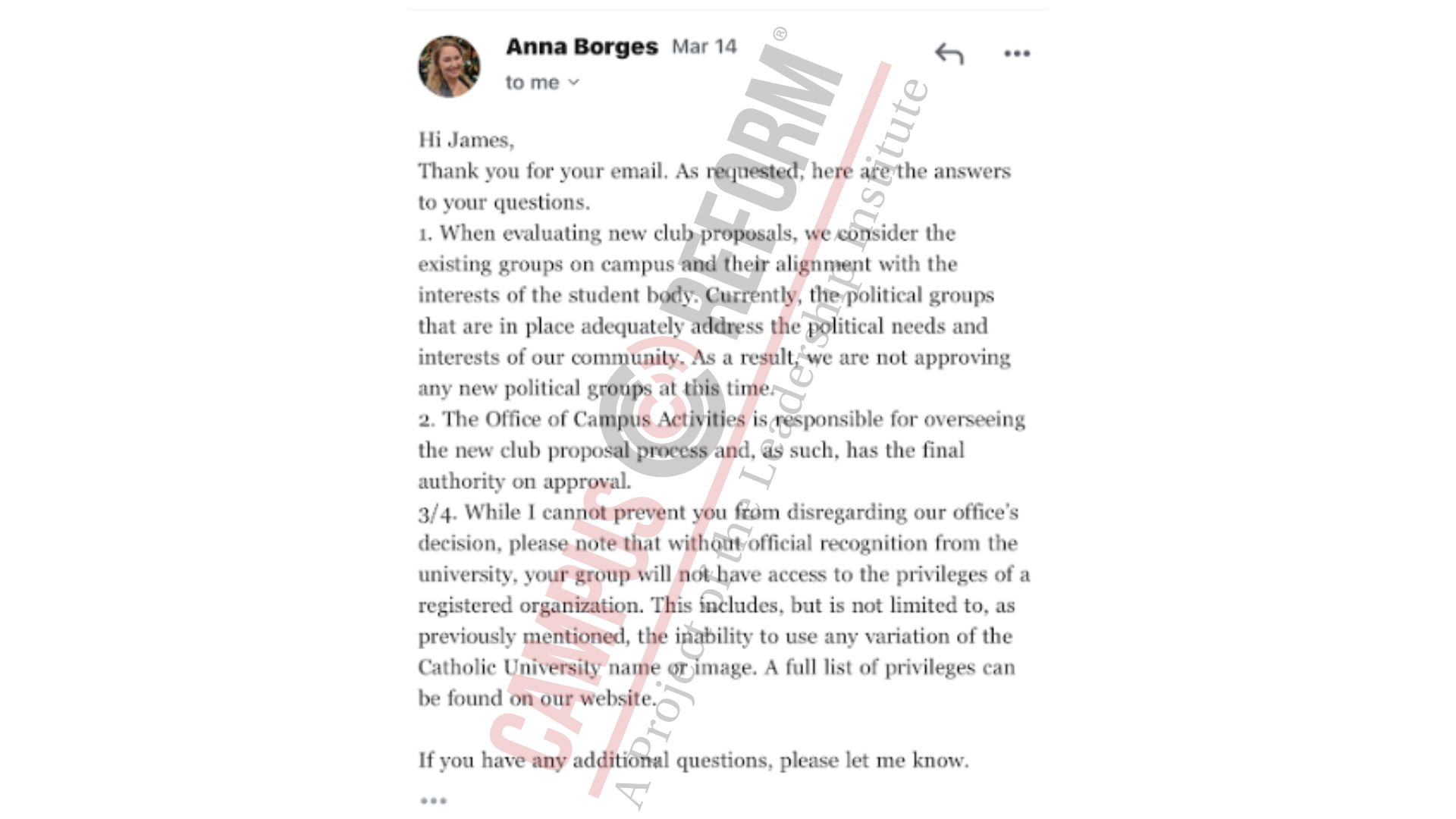 James Joseph Ong, the president of Catholic University’s TPUSA chapter, was told by a university official on March 12 that the school is “not in a position to expand our politically affiliated groups at this time.”