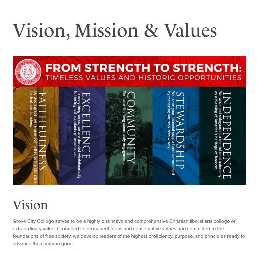 ”Grove City College strives to be a highly distinctive and comprehensive Christian liberal arts college of extraordinary value. Grounded in permanent ideas and conservative values and committed to the foundations of free society, we develop leaders of the highest proficiency, purpose and principles ready to advance the common good,” the new statement reads.