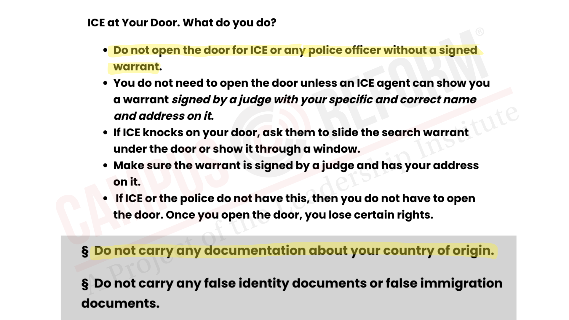 Another section linked to a “Family Preparedness Plan” advising illegal aliens not to open the door to Immigration and Customs Enforcement (ICE) agents and to avoid carrying forms of identification such as “any documentation about your country of origin.”