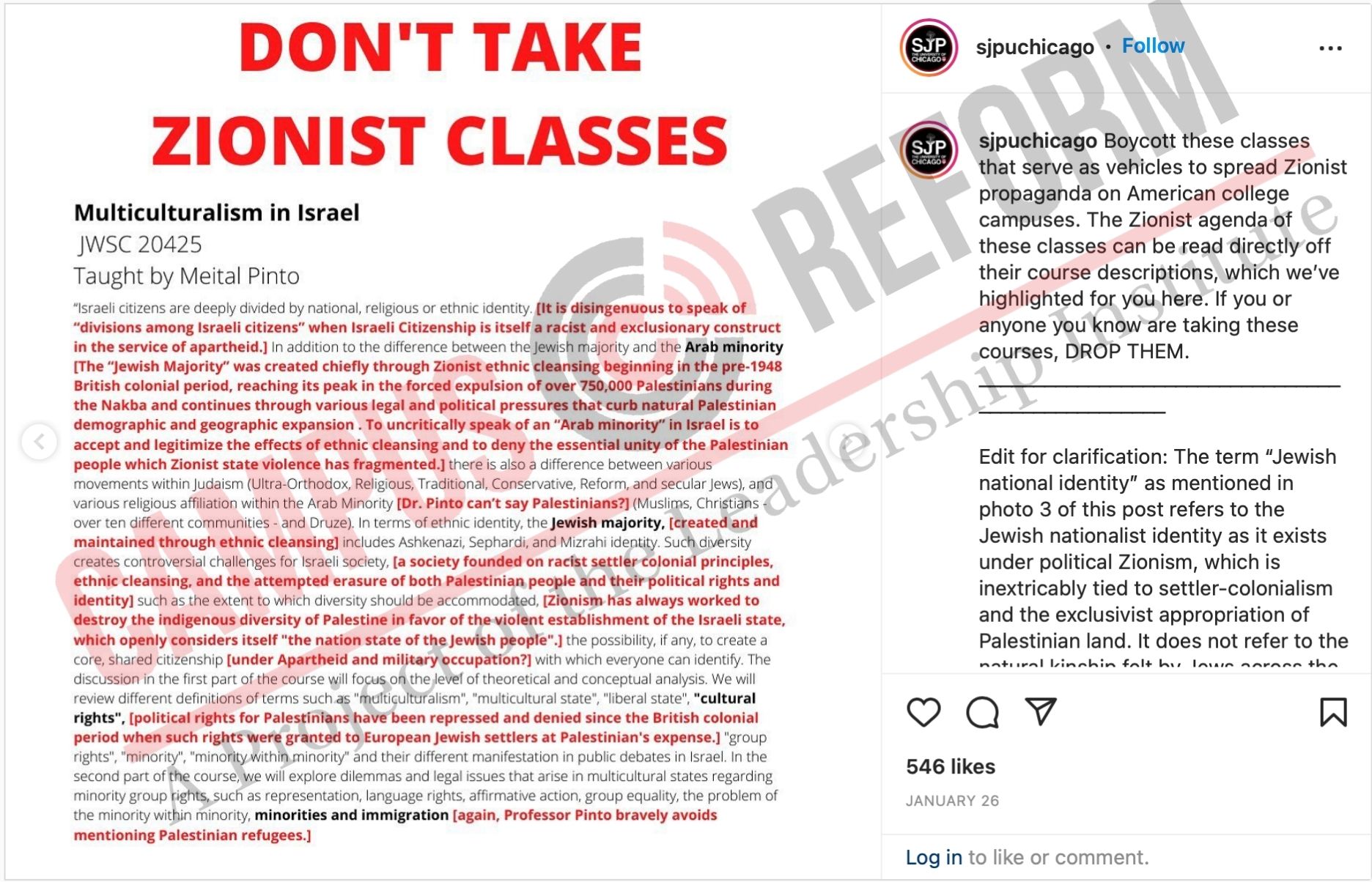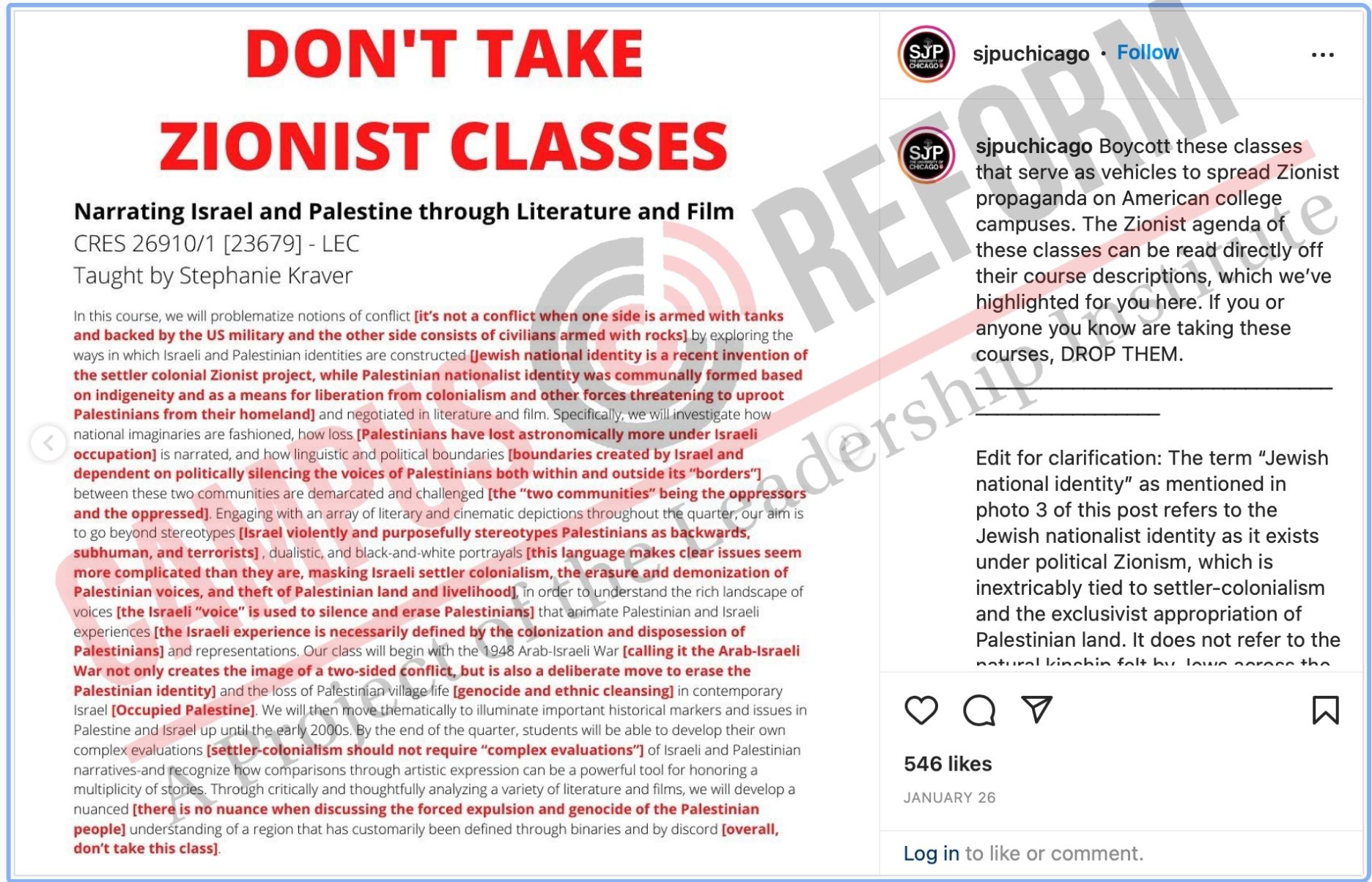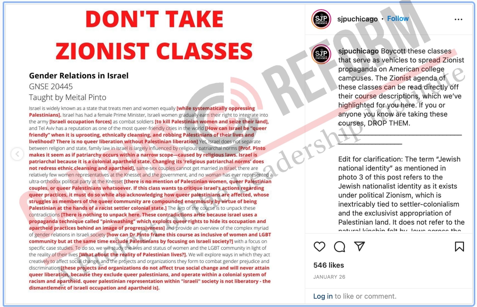 “DON’T TAKE SH*TTY ZIONIST CLASSES,” read the Instagram post from the school’s Students for Justice in Palestine chapter, calling on peers to boycott any classes “on Israel or those taught by Israeli fellows. By attending these classes, you are participating in a propaganda campaign that creates complicity in the continuation of Israel’s occupation of Palestine.”