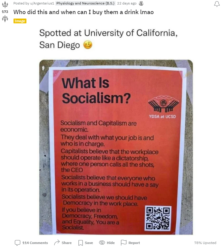 On the UCSD Reddit forum, one Reddit user created a post of an image of the YDSA’s poster, receiving 114 comments to date.