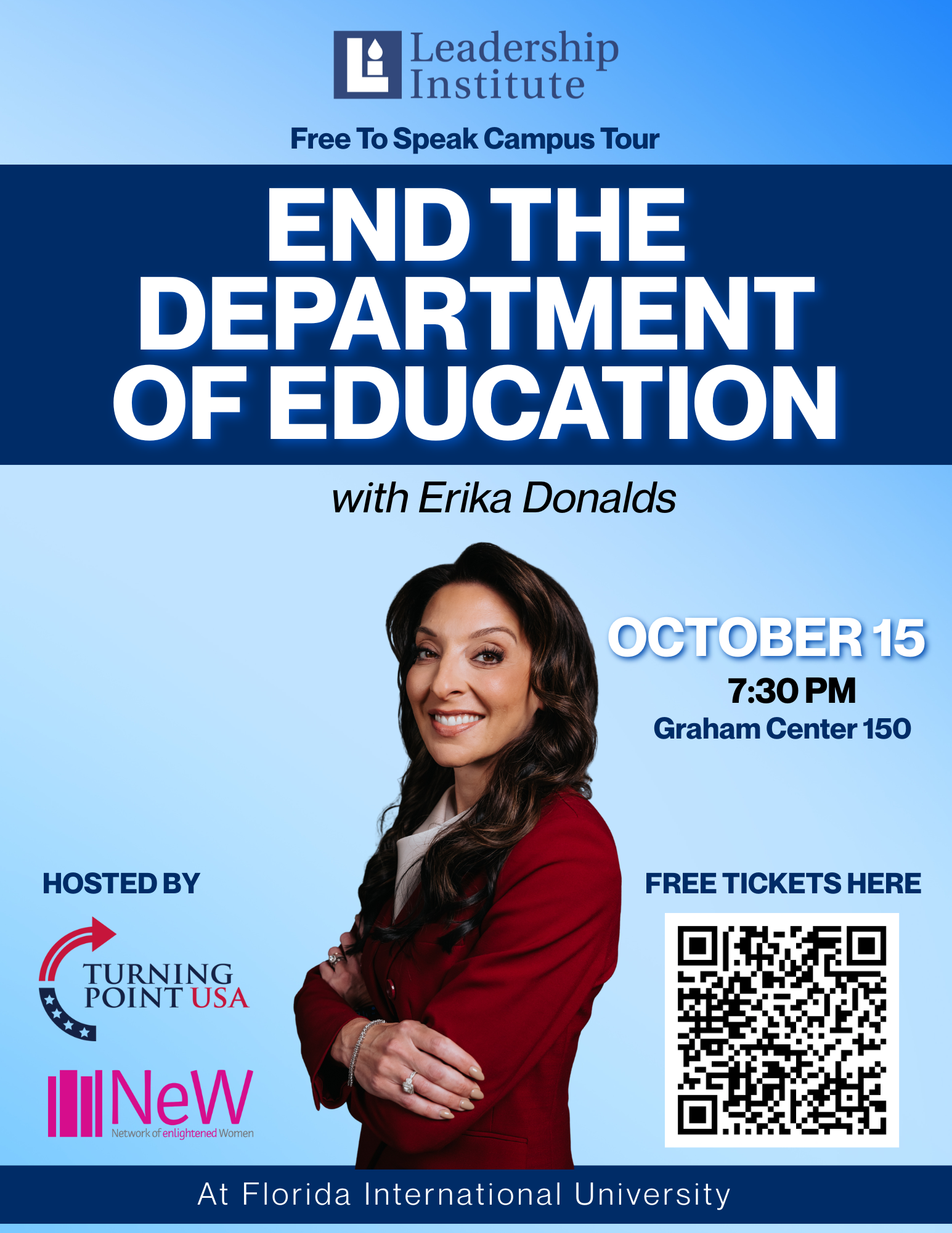 Donalds, who has helped shape national education policy and founded a charter school management foundation, is speaking to students across the country as part of the Leadership Institute’s “Free to Speak” tour on college campuses. Wednesday’s speech was hosted by FIU’s Turning Point USA (TPUSA) and Network of Enlightened Women (NeW) chapters.