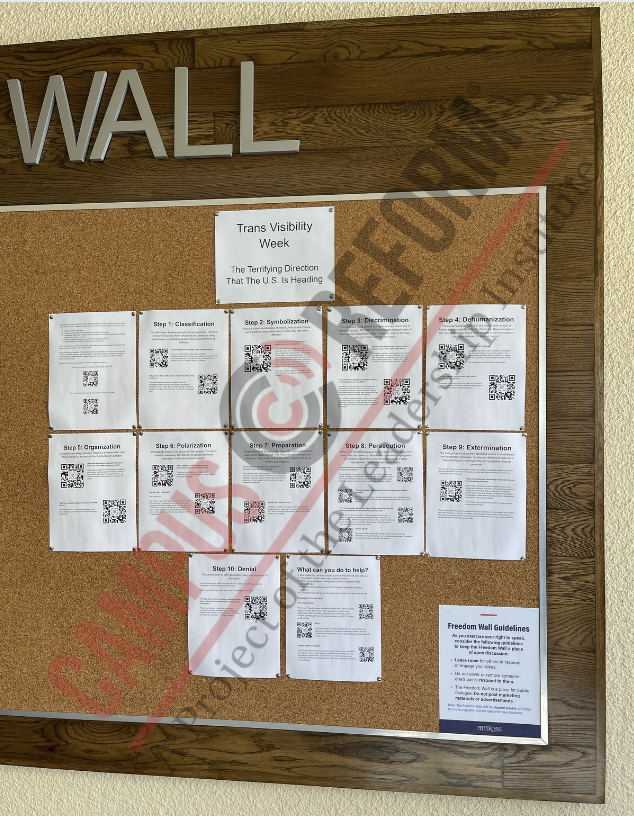 “How far has the anti-trans movement advanced along these stages [of genocide]?” a flyer posted to a Pepperdine University bullet board, called the “Freedom Wall,” questions.