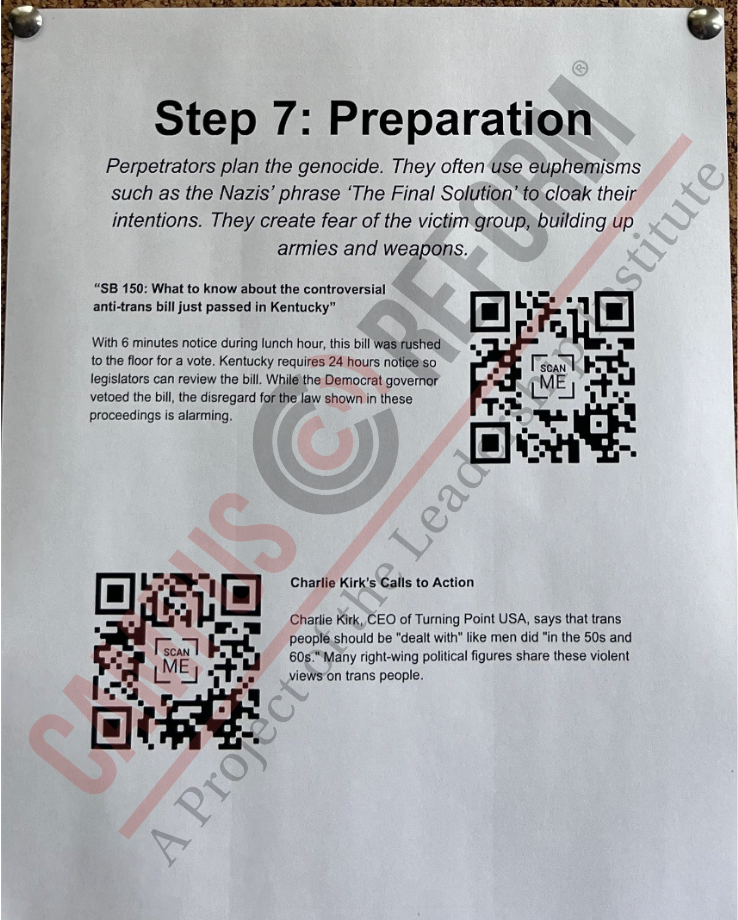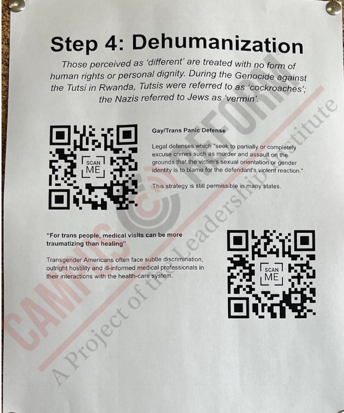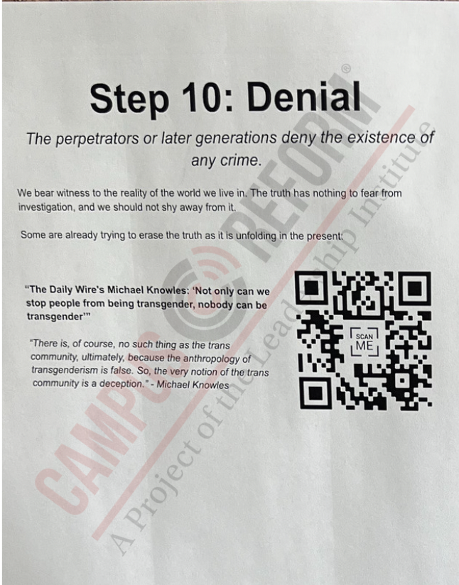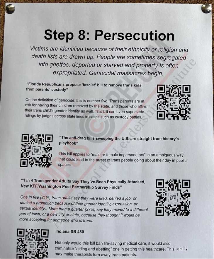 Every flyer featured one of the ten stages of genocide, relating each to the “anti-trans movement”; seemingly comparing the Holocaust to the conservative movement to oppose transgender ideology, irreversible surgery and hormone blockers for minors, and related ideas and practices.