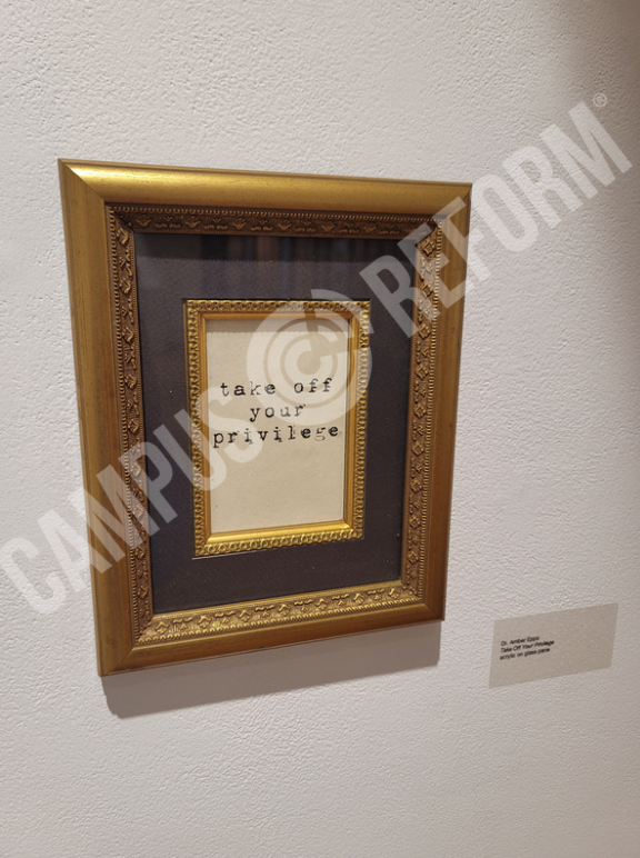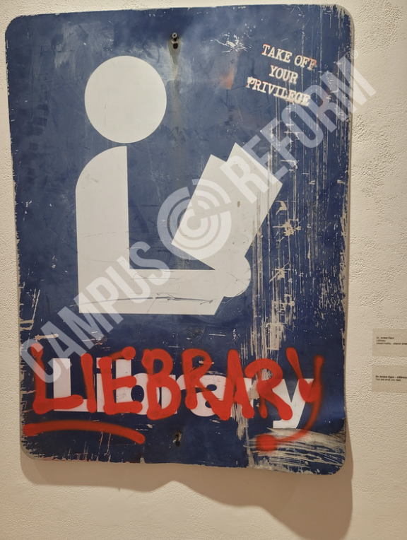 The museum featured several exhibits from the group, including one entitled “LIEbrary.” It consisted of an altered library street sign with the phrases “liebrary” and “take off your privilege” painted on it while hanging over a stack of history books. The latter was also painted in acrylic on glass in another exhibit titled, “Take Off Your Privilege.”