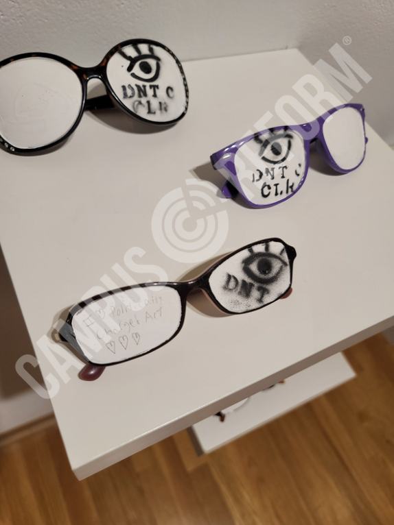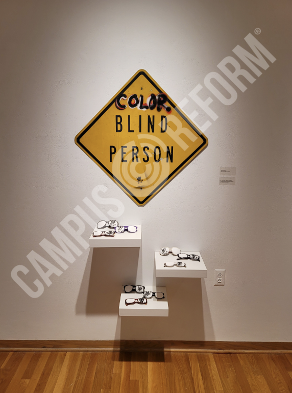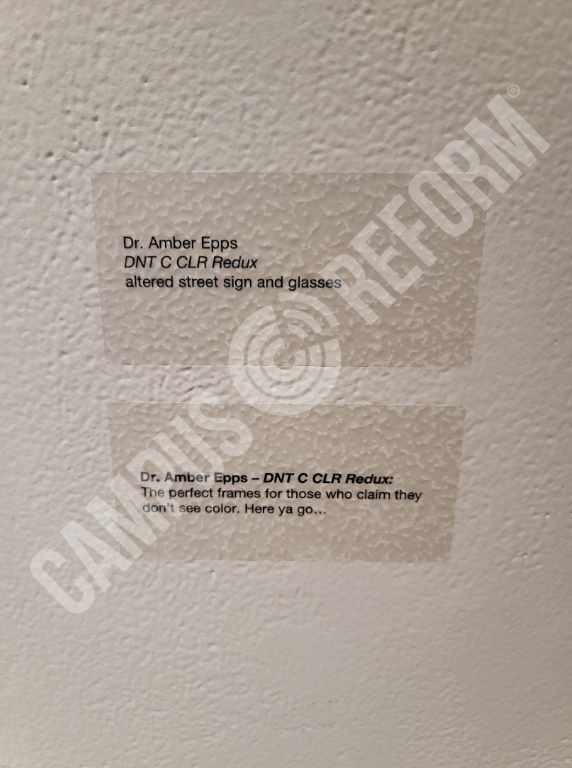 Another of Epps’ works, titled “DNT C CLR Redux,” consisted of a street sign altered to read “Color Blind Person” situated above glasses with painted white lenses. The glasses were painted with the phrase, “DNT C CLR.”