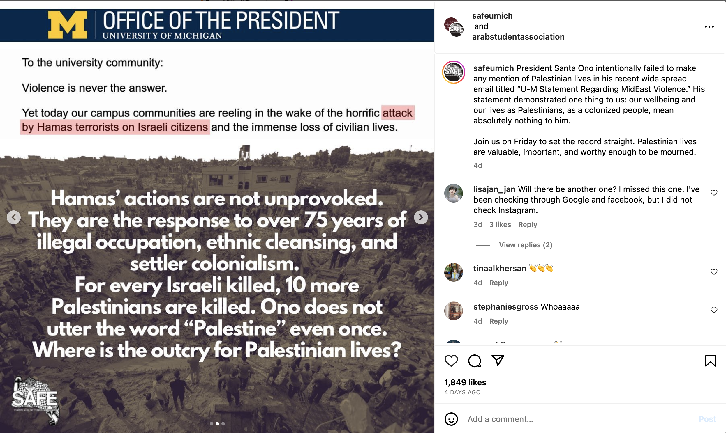 ”This violence has caused profound pain within the internationally and culturally diverse University of Michigan community. It is almost certain that more innocent civilians will lose their lives as the fighting escalates”