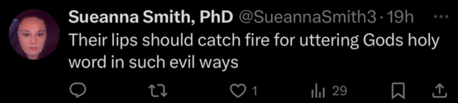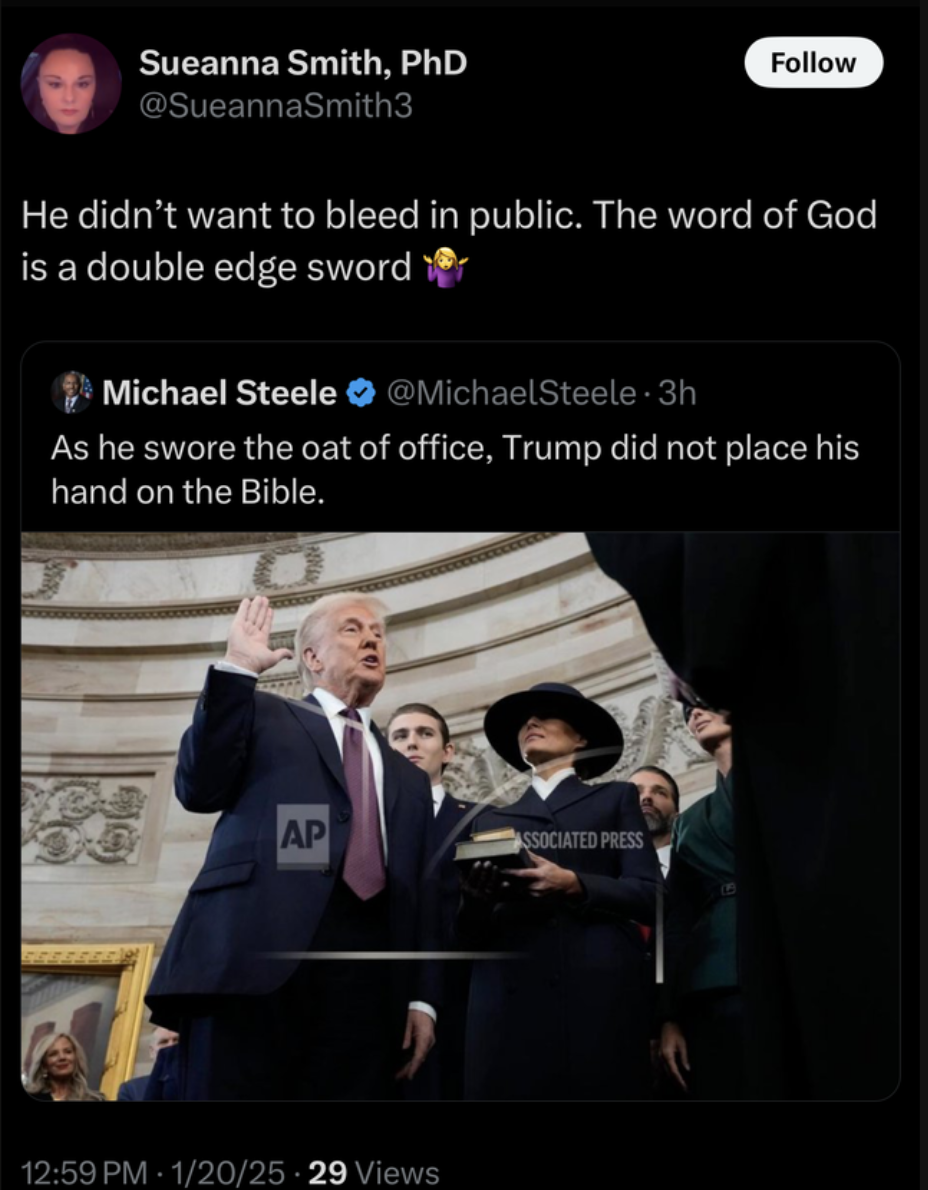 Before turning her X account private, Smith responded to another post about Trump not placing his hand on the Bible during the presidential oath, stating that the president “didn’t want to bleed in public.”