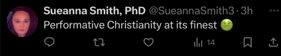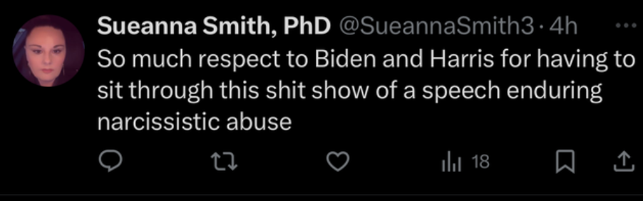 In a separate post, Smith appeared to call the inauguration “Performative Christianity at its finest,” and that she had “So much respect to Biden and Harris for having to sit through this s**w show of a speech enduring narcissistic abuse.”