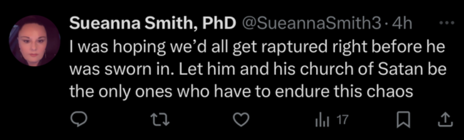 Smith also stated that, “I was hoping we’d all get raptured right before he was sworn in. Let him and his church of Satan be the only ones who have to endure this chaos.”
