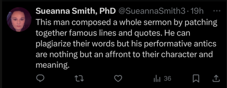 “This man composed a whole sermon by patching together famous lines and quotes,” Smith appeared to say of Trump. “He can plagiarize their words but his performative antics are nothing but an affront to their character and meaning.”