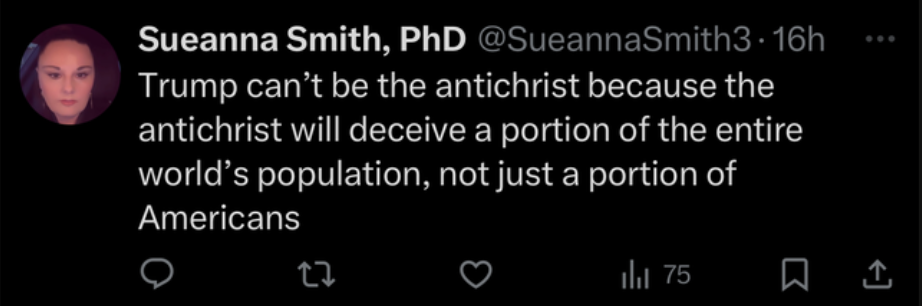 Smith also wrote that she believes “Trump can’t be the antichrist because the antichrist will deceive a portion of the entire world’s population, not just a portion of Americans.”