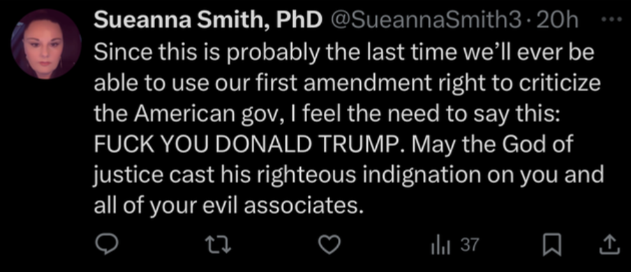 “Since this is probably the last time we’ll ever be able to use our first amendment right to criticize the American gov, I feel the need to say this: FUCK YOU DONALD TRUMP,” Smith added. “May the God of justice cast his righteous indignation on you and all of your evil associates.”