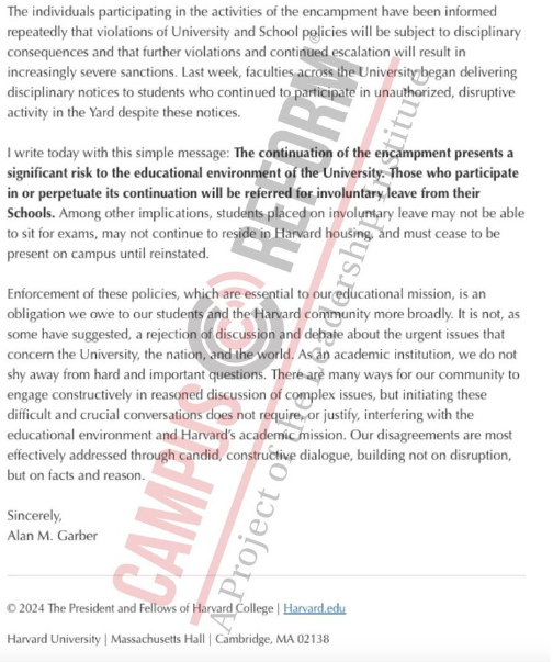 Harvard threatens to place its occupiers on 'involuntary leave,' citing 'indefensible' behavior: READ THE EMAIL