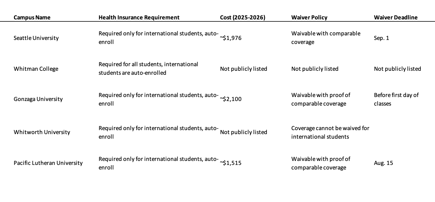 Seattle University – Required for international students only. Cost: ~$1,976. Waivable with comparable coverage. Deadline: Sep. 1.
