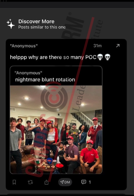 “Nightmare blunt rotation,” read one Fizz post with over 1,800 upvotes. “Helppp why are there so many [people of color],” read another.
