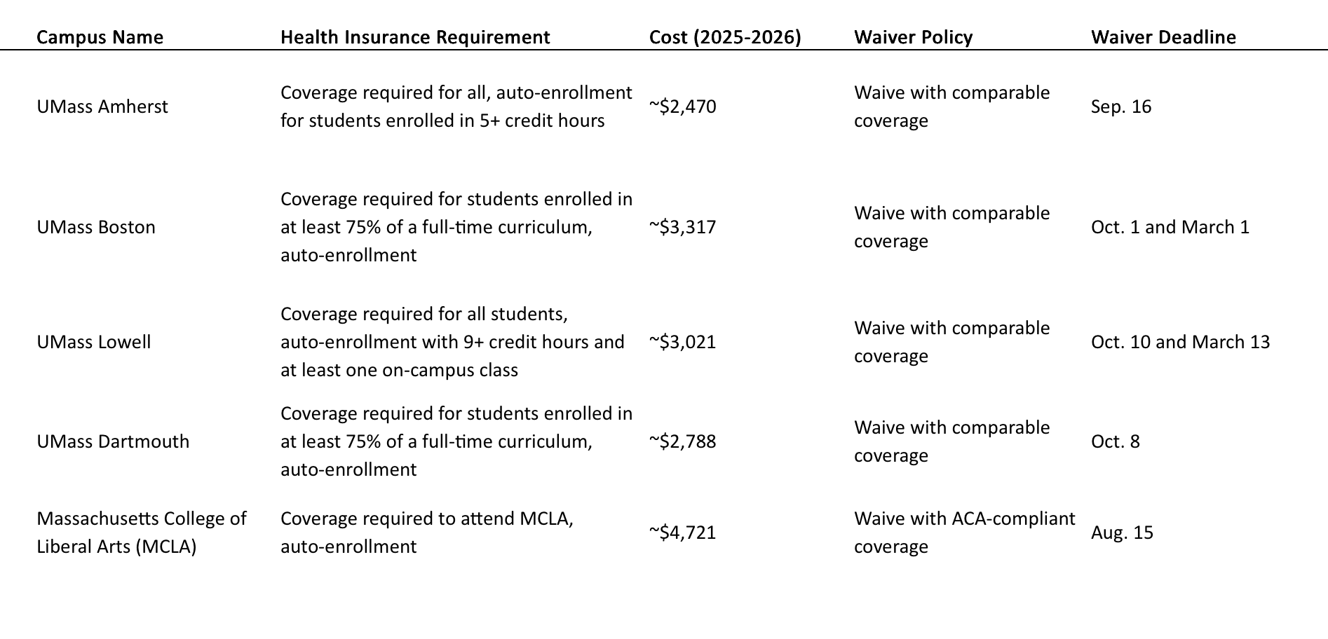Both public and private universities across Massachusetts require health insurance for students, with many auto-enrolling attendees in expensive school plans.