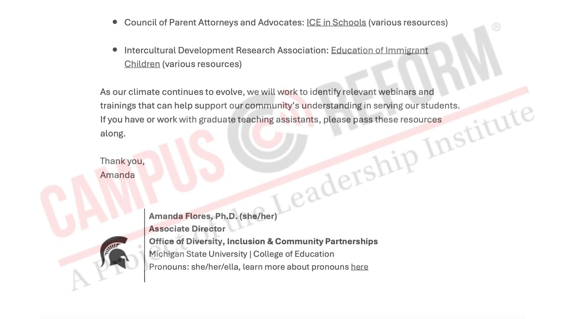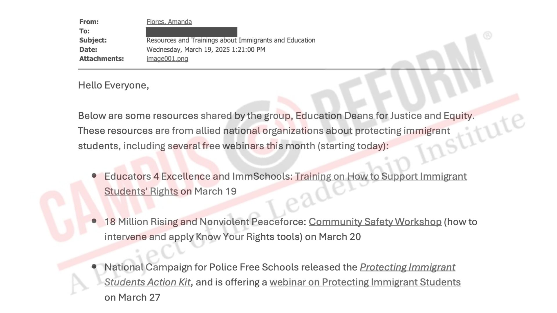Campus Reform obtained a copy of that email with the subject line, “Resources and Trainings about Immigrants and Education,” a few days after it was sent.