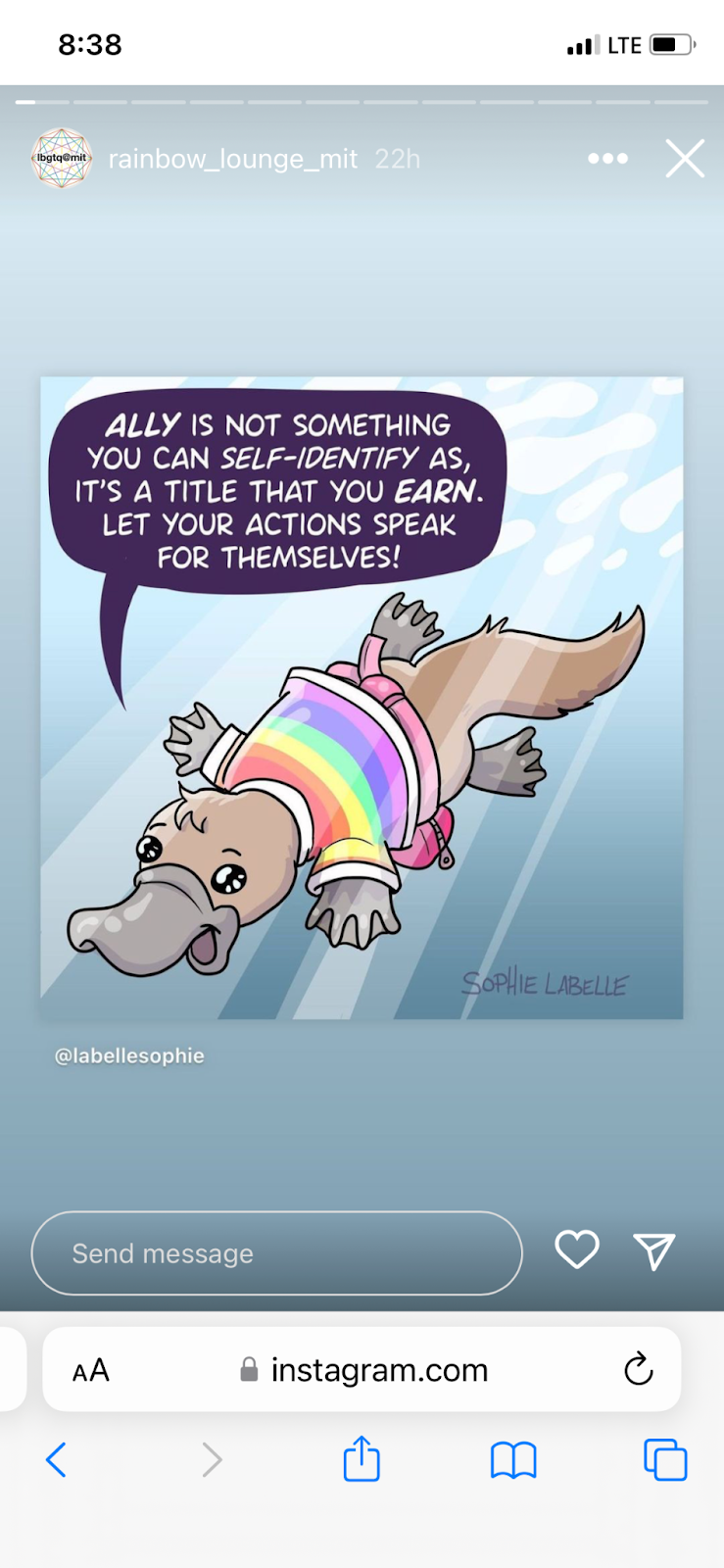 “Ally is not something you can self-identify as, it’s a title that you earn,” the cartoon features a platypus in a rainbow shirt saying. “Let your actions speak for themselves!”