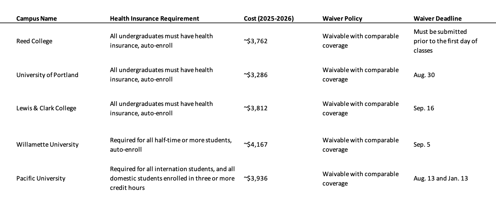 Private universities in Oregon apply health insurance requirements more broadly. Most require all undergraduates to carry insurance and auto-enroll them into costly school-sponsored plans unless a waiver is approved.