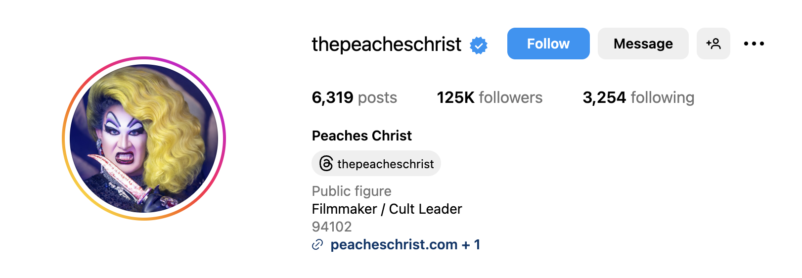Peaches Christ, whose real name is Joshua Grannell, is a self-described “Filmmaker” and “Cult Leader.” The performer is also a graduate of Penn State University.