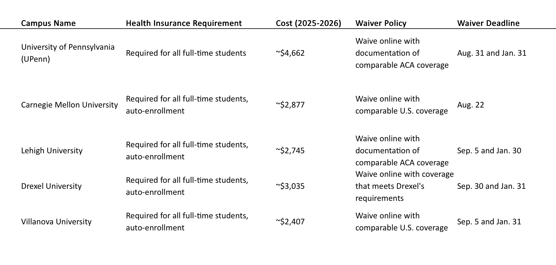 University of Pennsylvania (UPenn): Coverage mandated for all full-time students (~$4,662/year). Waivers require ACA-compliant plans. Deadlines: Aug. 31 and Jan. 31.