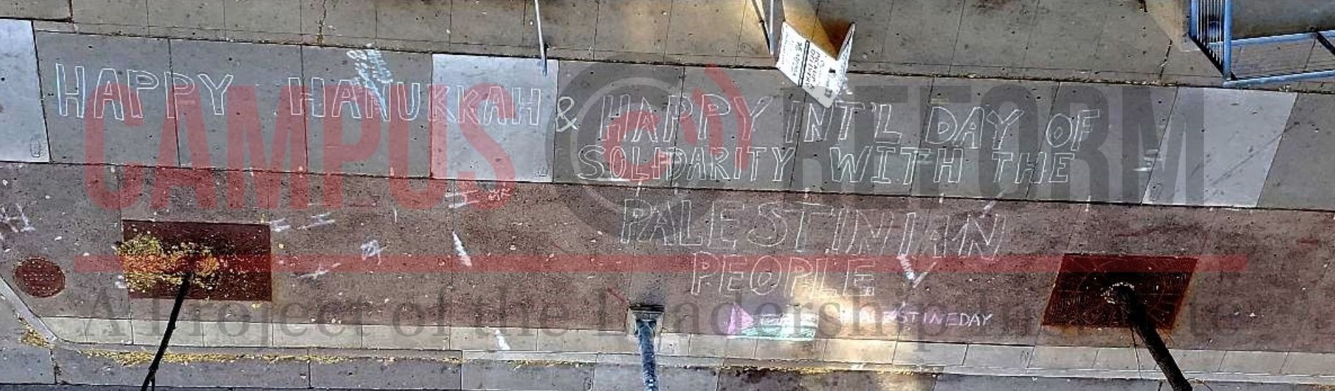 That is when the group discovered the phrase “HAPPY INT’L DAY OF SOLIDARITY WITH THE PALESTINIAN PEOPLE” written above a picture of the Palestinian flag and next to the chalked message “HAPPY HANUKKAH,” according to a photograph in a university email obtained by Campus Reform.