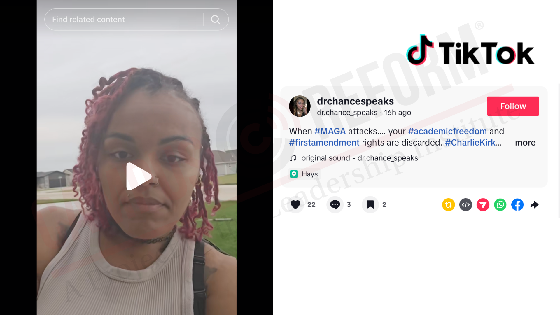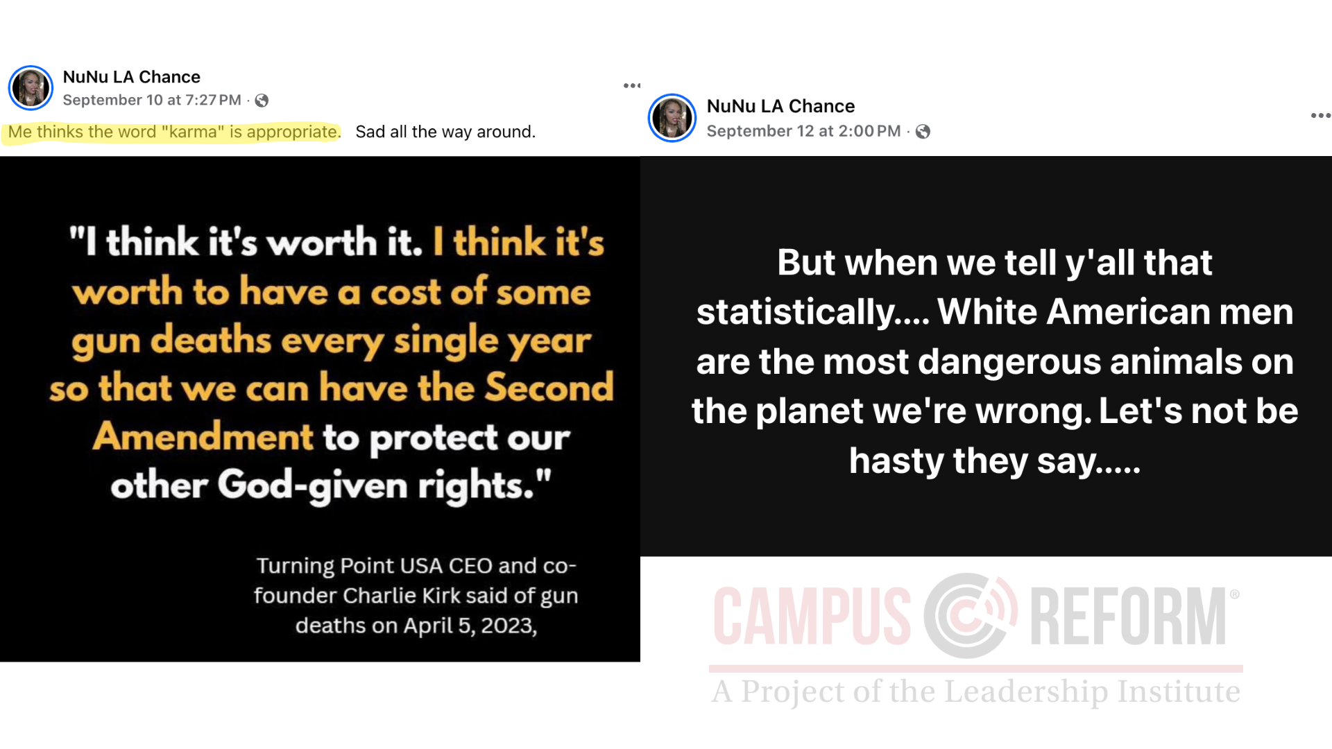 Nuchelle Chance, an assistant psychology professor at Fort Hays State University (FHSU), made controversial statements on Facebook labeling White men 'dangerous animals' and calling Charlie Kirk’s assassination 'karma.'