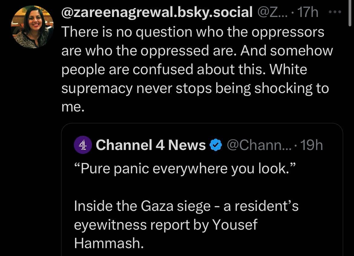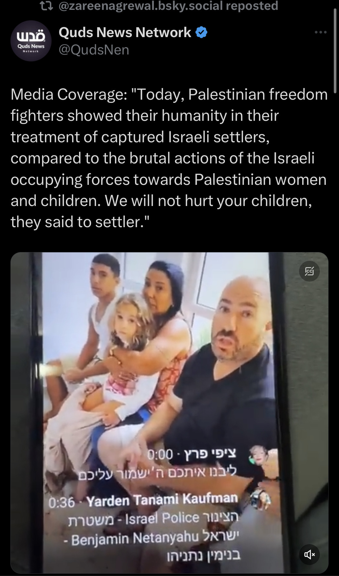 Using the account @zareenagrewal.bsky.social, Grewal reposted on X a Quds post showing an Israeli family being taken hostage with the caption, “Today, Palestinian freedom fighters showed their humanity in their treatment of captured Israelis...We will not hurt your children, they said to settler [sic].”