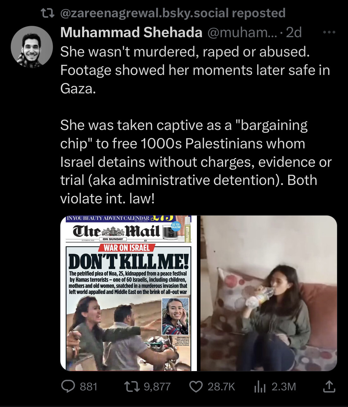 ”She wasn’t murdered, raped or abused,” Muhammad Shehada’s post read. “Footage showed her moments later safe in Gaza.”