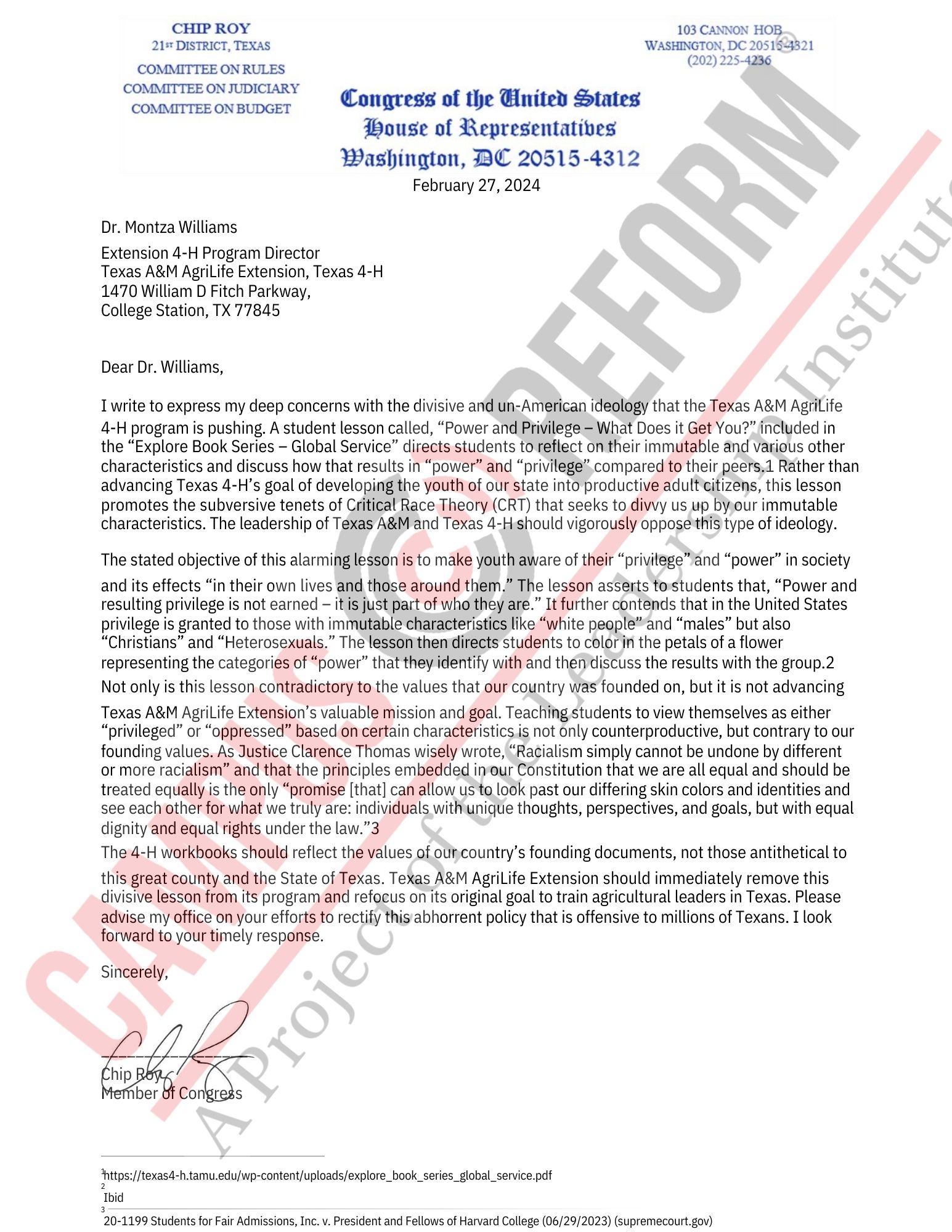 In a Wednesday letter to Texas A&M AgriLife Extension Service Director Dr. Montza Williams, Roy called on Texas A&M to remove content from 4-H program workbooks that he says ‘promotes the subversive tenets of Critical Race Theory, which “seeks to divvy us up by our immutable characteristics.” This, Roy says is runs completely counter to Texas 4-H’s ‘goal of developing the youth of our state into productive adult citizens. “The leadership of Texas A&M and Texas 4-H should vigorously oppose this type of ideology,” Roy added.