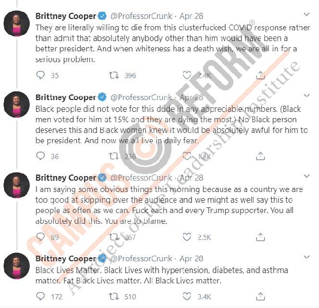 Rutgers University Associate Professor of Women’s, Gender, and Sexuality Studies Brittney Cooper says Trump supporters are to blame for the disproportionate number of black Americans who have died as a result of the coronavirus pandemic.