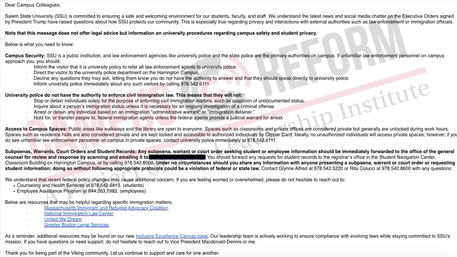 A separate email from university General Counsel Rita Colucci on Jan. 29 lists Salem State policies relating to law enforcement and immigration law.