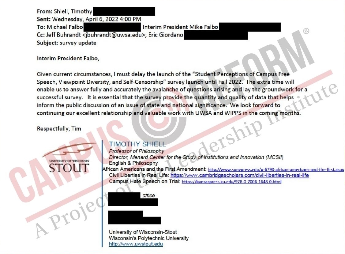 ”Given the current circumstances, I must delay the launch of the ‘Student Perceptions of Campus Free Speech, Viewpoint Diversity, and Self-Censorship’ survey launch until Fall 2022,” the email reads. “The extra time will enable us to answer fully and accurately the avalanche of questions arising and lay the groundwork for a successful survey.”