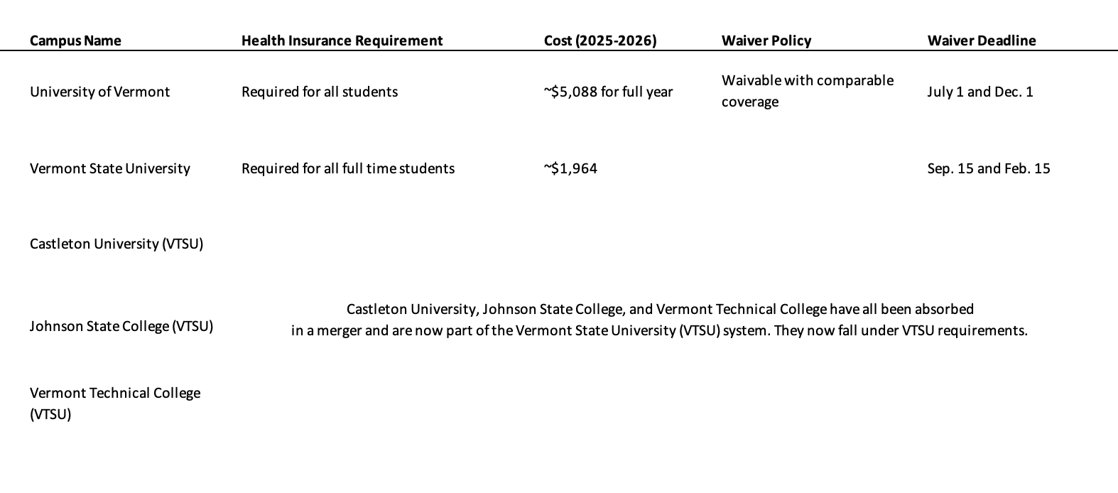 Vermont State University (VTSU, includes absorbed campuses) – Required for all full-time students. Cost: ~$1,964. Waivable with comparable coverage. Deadlines: Sep. 15 and Feb. 15.